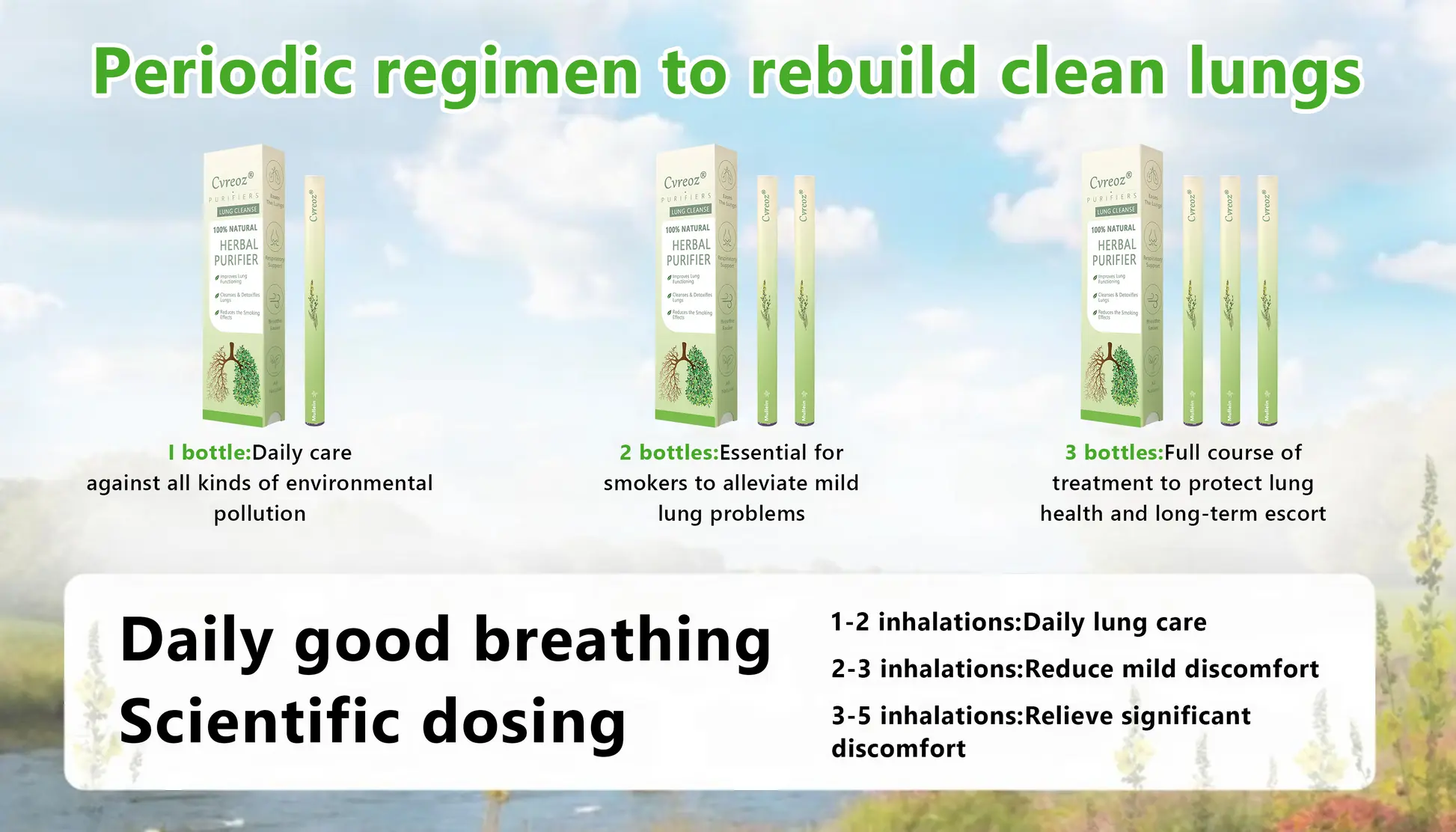 A: For general lung maintenance and urban air exposure, 1 inhale per day is ideal. If you’re experiencing coughing, congestion, or post-smoking discomfort, increase to 2โ3 inhales per day. ย ๐ถ๐ฏ๐ซ๐พ๐จ๐ยฎโs natural, non-addictive formula is safe for extended use and can be incorporated into your long-term wellness routine with confidence.