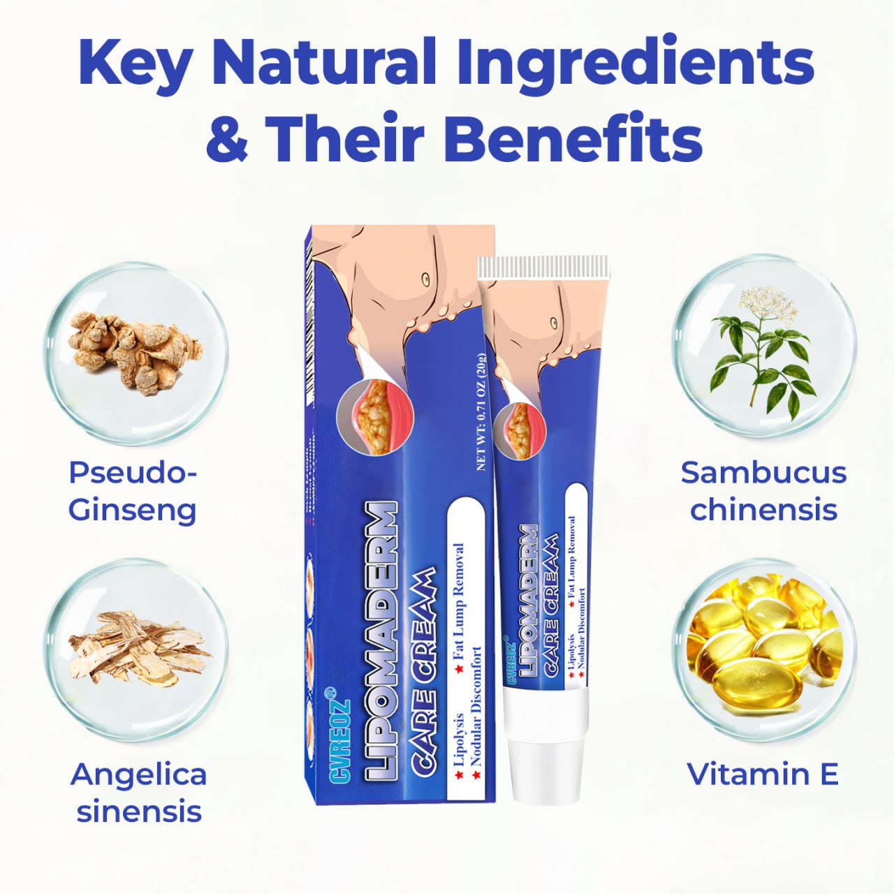 Made with natural ingredients like Angelica sinensis, Pseudo-ginseng, Sambucus chinensis. Cvreoz® LipomaDerm Cream helps reduce benign fatty lumps and cysts. Its fast-absorbing formula soothes discomfort, boosts circulation, and promotes smoother, healthier skin—naturally and safely.